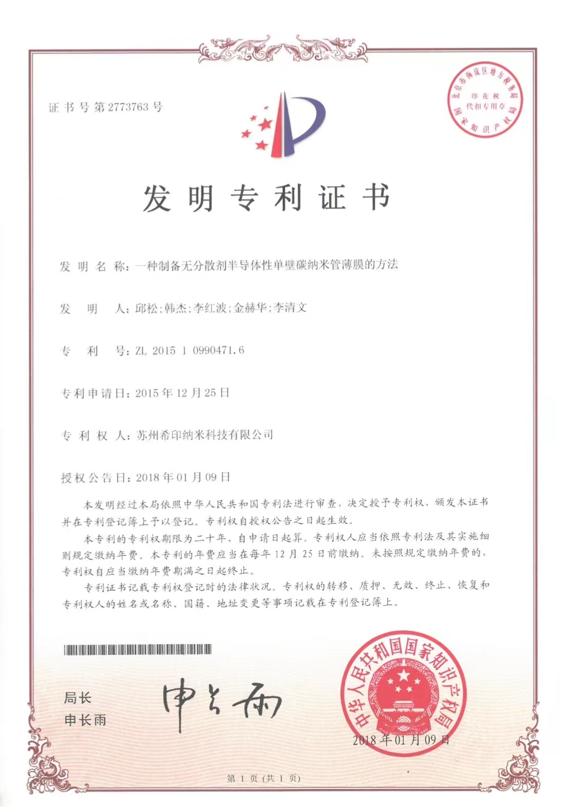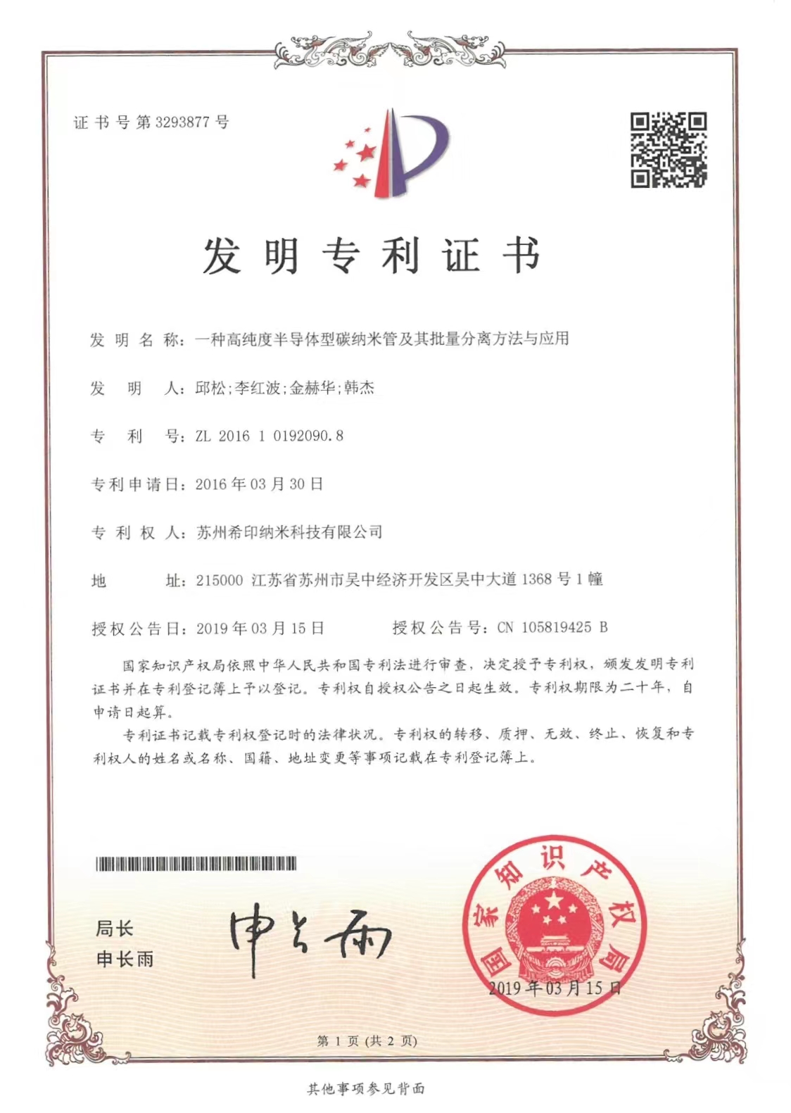 苏州希印纳米科技有限公司是由一批海归博士团队创办的集研发、生产、销售和技术服务为一体的科技型企业。依托中国科学院的最新科研成果、技术与研发资源,开展高质量纳米产品的研发与推广。公司承担了多项国家级科技项目,掌握了碳纳米管材料领域多项具有国际领先水平的核心技术并拥有核心专利,具有强大的研发能力。公司主营高纯度碳纳米管及其功能分散液产品,掌握着高纯度半导体碳纳米管的可控分离、高性能碳管分散液开发、碳纳米管薄膜制备及相关电子器件研制等全系列关键技术,面向客户提供各种高纯度碳纳米管、碳纳米管分散液、碳纳米管薄膜及其它纳米功能产品和整体解决方案。