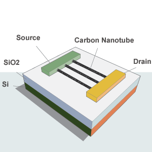 场效应晶体管(FET)半导体碳纳米管(semiconducting CNT)可以代替或弥补传统半导体在高性能和低成本薄膜晶体(TFT)两个方面的不足。如今,薄膜晶体常用来作为LCD和OLED显示器背板。随着柔性电子工业的成熟,薄膜晶体可能会与越来越多的商业电子产品结合。